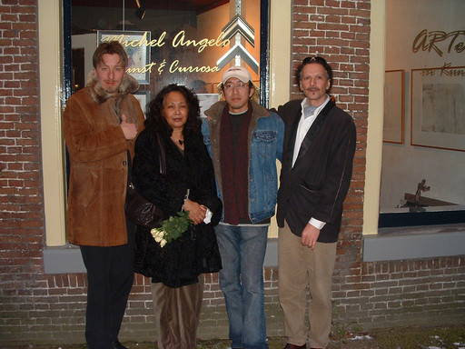 2005 Expositie - De Polderzolder, Eewal 92 te Leeuwarden. 5 t/m 31 maart. Op de foto Rena met kunstenaarsvrienden: Michel Pol beter bekend als 'Pol-Art' - de Chinese Kunstenaar Hanzhongnai -en ' The great painter of symbolism ' Emile Snellen van Vollenhoven. '